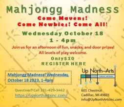 Mahjongg Madness! All levels of play welcome. 1-4pm. $10, includes refreshments and door prizes. Up North Arts, 601 Chestnut, Cadillac. Pre-registration recommended on-line. https://upnorthartsinc.com/classes. 231-429-5462